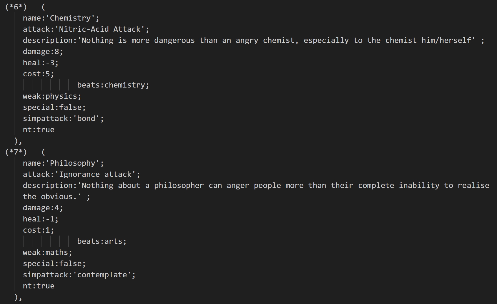 "A MUD set in Trinity College that I wrote in freepascal." The second thing listed on increpare.com, about a year and half after the first. It seems that both of these games are concerned with academic disciplines and university departments. As with MathCIV I wasn't able to play this game, in this case because I couldn't find some of the pascal libraries that it needs to compile. But looking at the source code, the map of the MUD is based on some buildings at Trinity College Dublin, and it seems like characters in the game can maybe use attacks based on various fields of study.